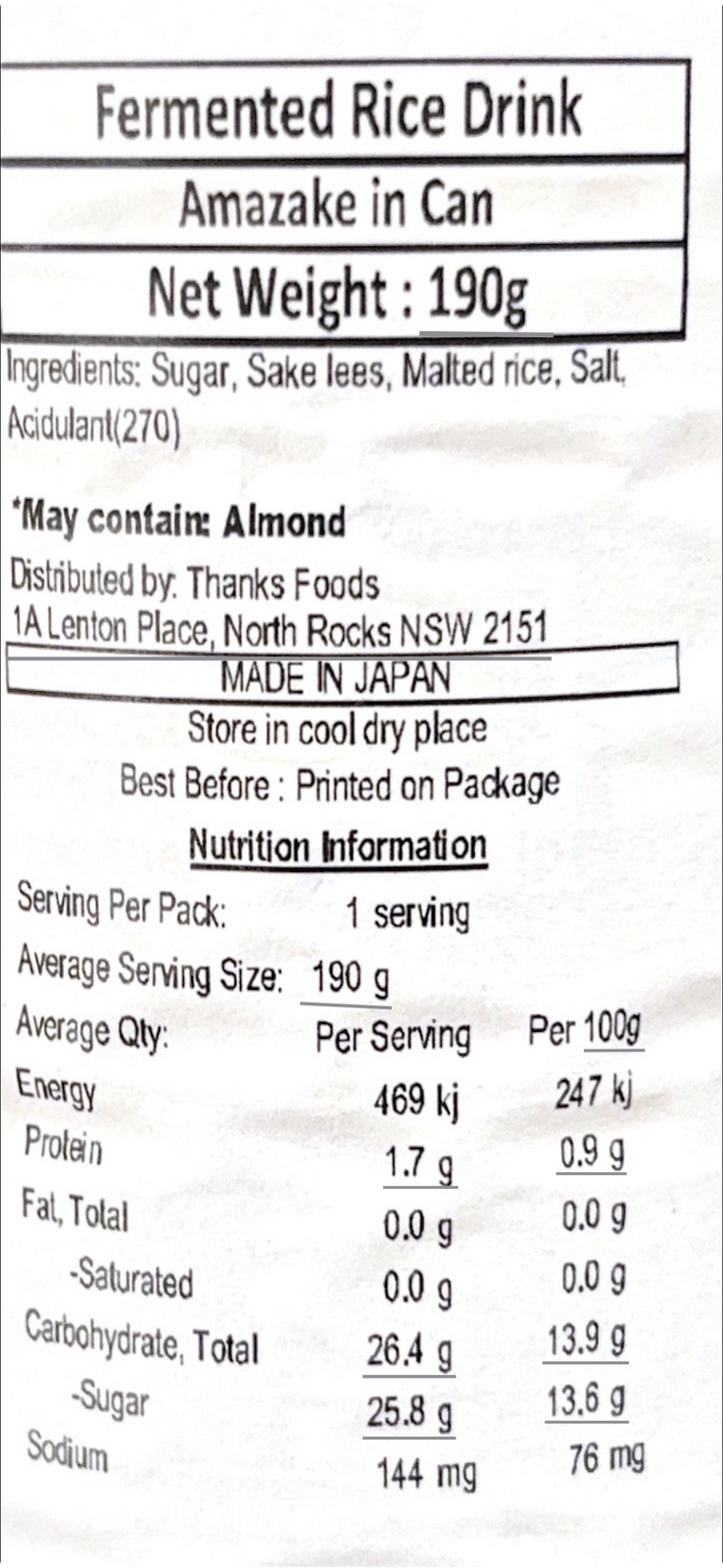Amazake is a traditional Japanese drink made of fermented rice. It has a creamy, thick consistency with a sweet flavour, served either chilled or warm/hot. Although it is commonly called sweet sake, this MORINAGA Amazake only contains less than 1% of alcohol (Almost non-Alcohol).